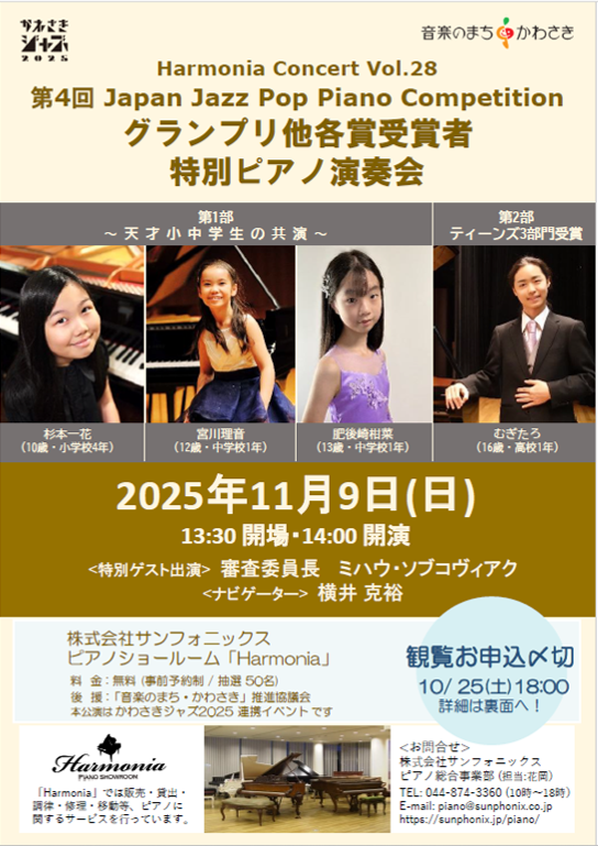 | Harmonia Concert Vol.26 | Japan Jazz Pop Piano Competition グランプリ受賞者ガラコンサート | 2024年11月17日 |