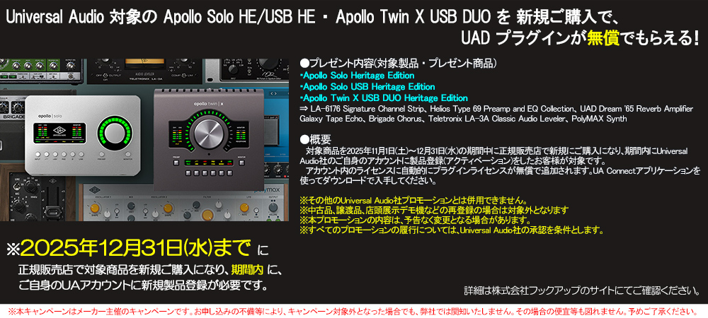 ※Heritage Editionプラグインを受け取るためには、Universal Audio社サイトにて対象となるApolloハードウェアを製品登録する必要があります。