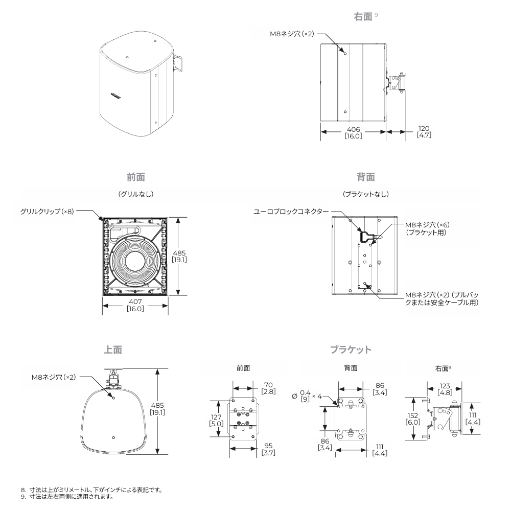 吊り下げ/取り付け:(12)M8ねじ込みインサート(上部2個、側面2個、後部8個)