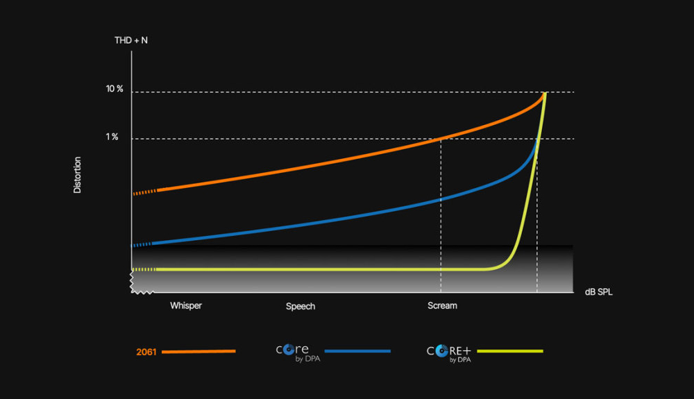 CORE+は、ダイナミックレンジ全体で歪みを徹底的に低減し、計測不可能なレベルまでノイズを除去する技術です。従来の「CORE」を更に発展させ、クリッピングポイントに近い音圧レベルでもダイヤフラムの出力をリニアに維持できるため、大音圧環境においてもTHD(全高調波歪み)が実質計測不可能となります。つまり、CORE+は最大音圧レベルを引き上げるのではなく、ダイナミックレンジの上限を低音圧帯域と同様にクリーンに保つことで、全帯域にわたる透明度を向上させる技術です。