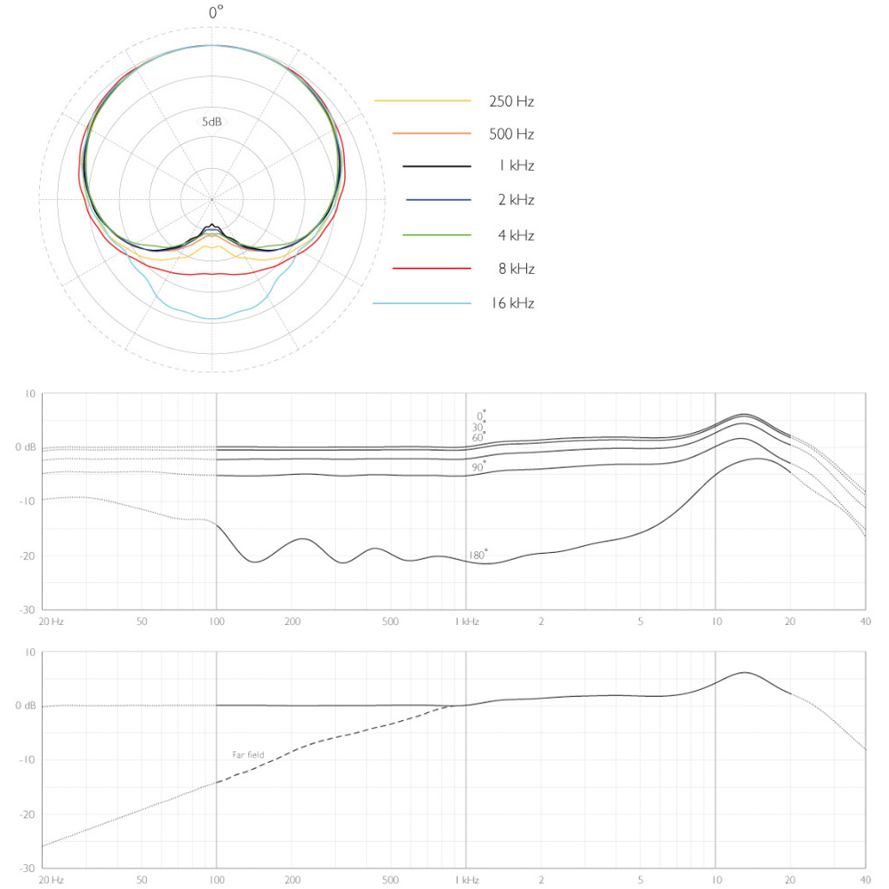 指向特性図・周波数特性図(左:軸上・軸外特性 右:近接収音と遠隔収音):